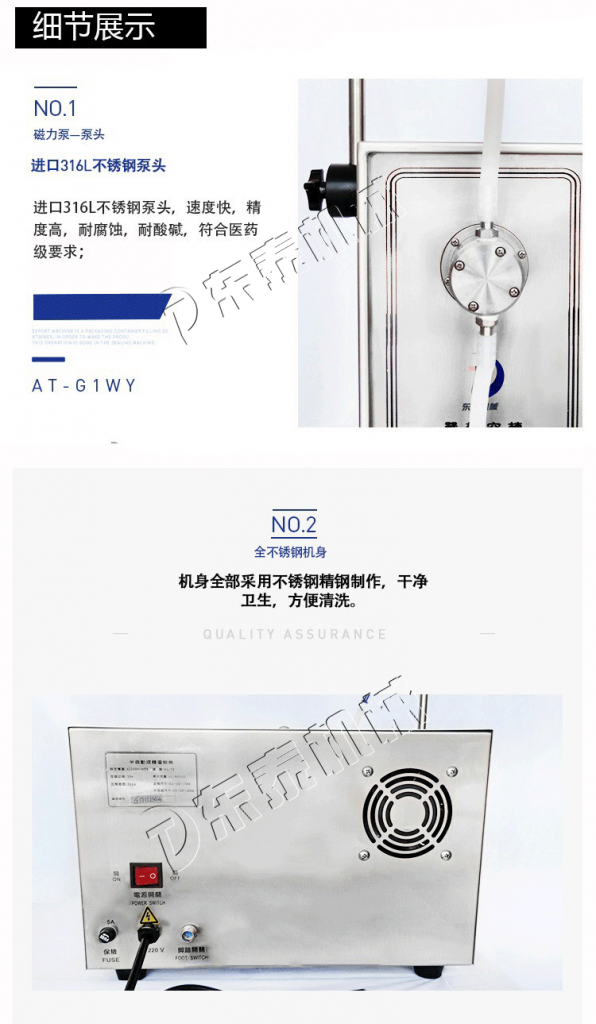 1、消毒水液體灌裝旋蓋線所有元件均采用,電機(jī)為優(yōu)質(zhì)臺邦電機(jī),快捷更換蠕動泵管配置,清洗更方便。機(jī)身為鋁合金+不銹鋼。本機(jī)操作簡單、直觀方便,自動感應(yīng),無瓶不灌裝,灌裝和旋蓋部分過渡,可獨(dú)立使用灌裝機(jī)或者旋蓋機(jī)部分,另旋蓋機(jī)標(biāo)配自動分瓶功能,方便小瓶旋蓋,性能穩(wěn)定,可靠,效率高。