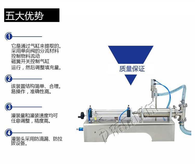 小型液體定量灌裝機(jī),通過氣缸帶動一個活塞來抽取和打出物料,用單項(xiàng)閥控制物料流向,小型液體定量灌裝機(jī)用磁簧開關(guān)控制氣缸的行程,即可調(diào)節(jié)灌裝量。